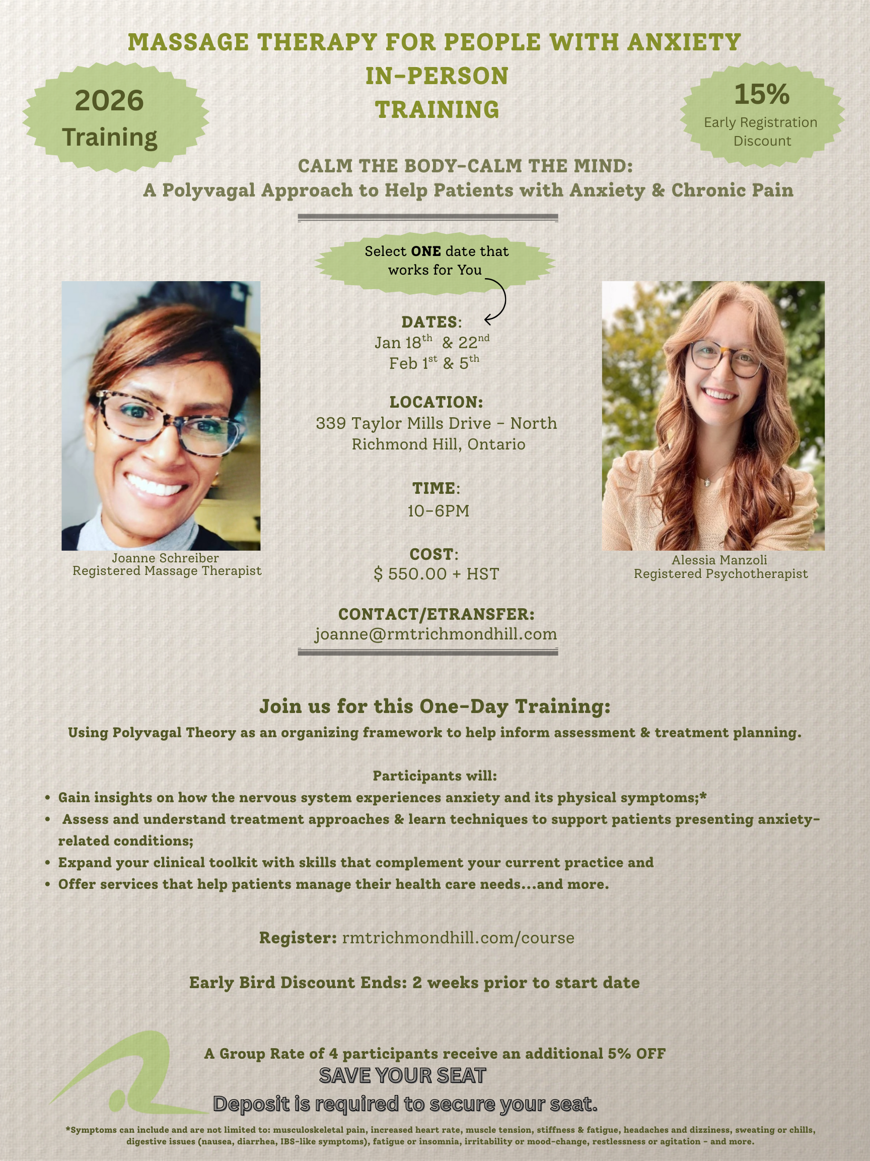 Drawing from massage therapy assessment framework, anatomy, neurophyisiology, and principles of Polyvagal Theory this training focuses on observation, palpation and clinical reasoning to support safe and patient-centered treatment planning within the massage therapy scope of practice.
