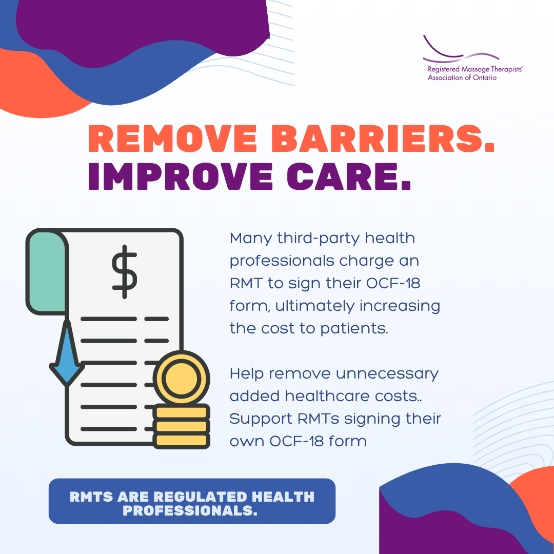 Many Ontarians can’t access the healthcare they need simply because of cost. Many health professionals will charge to sign an RMT’s OCF-18 form, ultimately increasing the healthcare cost to patients.