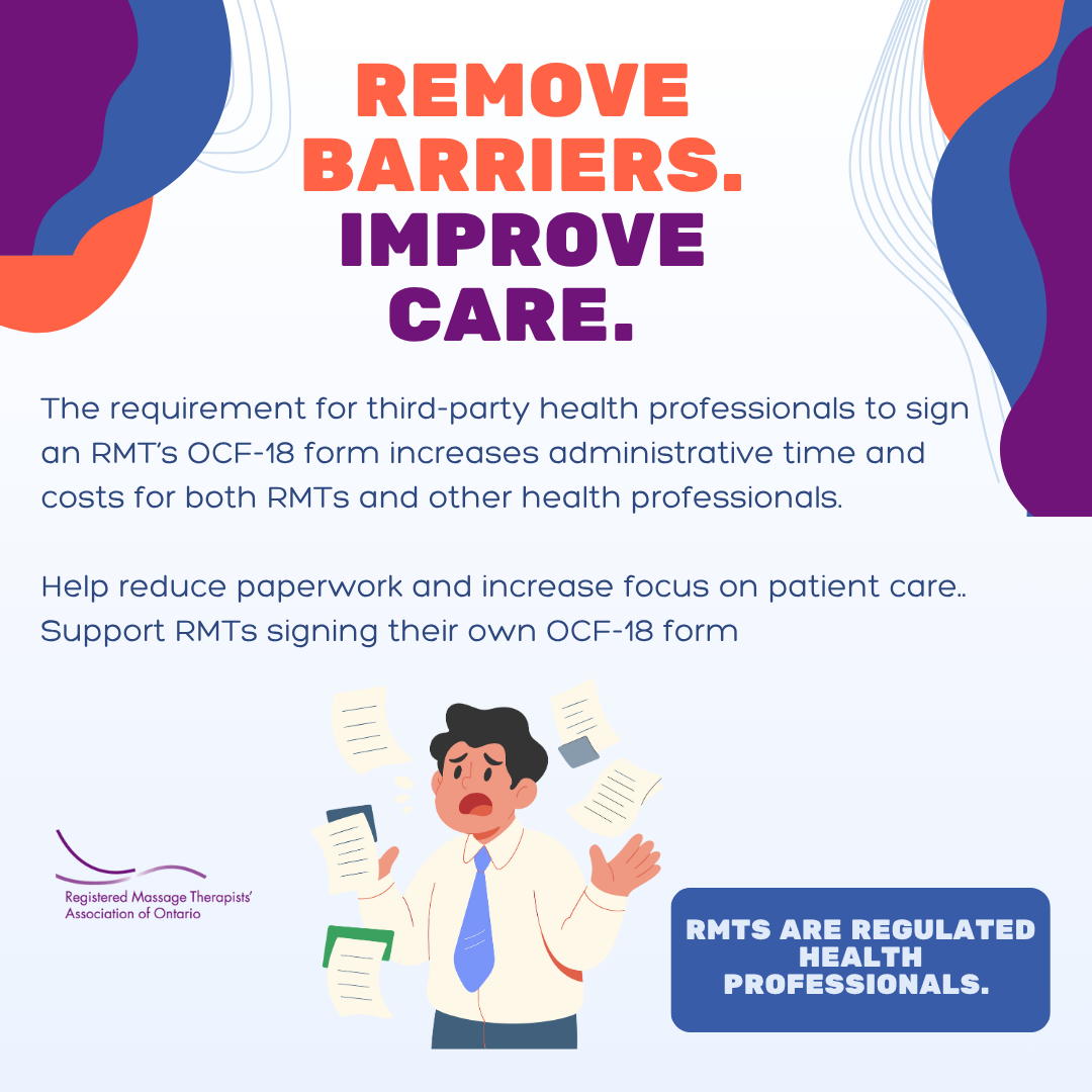 The requirement for a third-party health professional to sign an RMT’s OCF-18 form takes away time from both RMTs and other health professionals, time that could be better used providing healthcare to their patients.