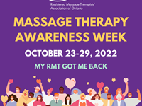 Massage Therapy Awareness Week is October 23-29, 2022, and this year to celebrate the RMTAO will be focusing on the different ways massage therapy can get people back to the activities that are important to them. This could be getting back to a sport they love, getting back to work, getting more done around the house, and much more.